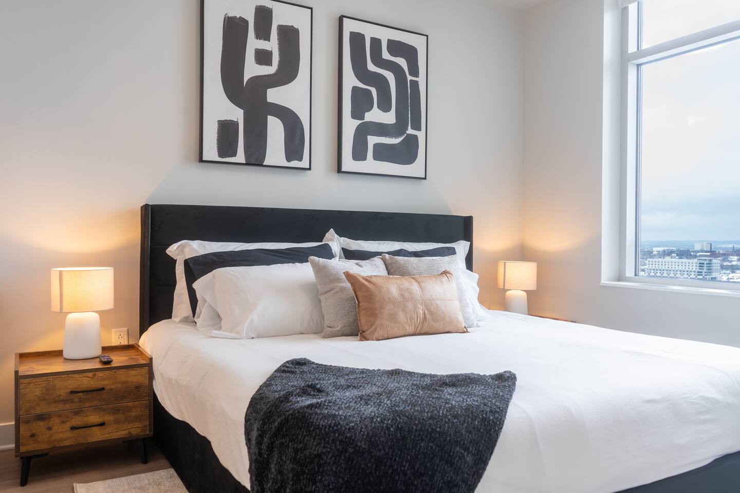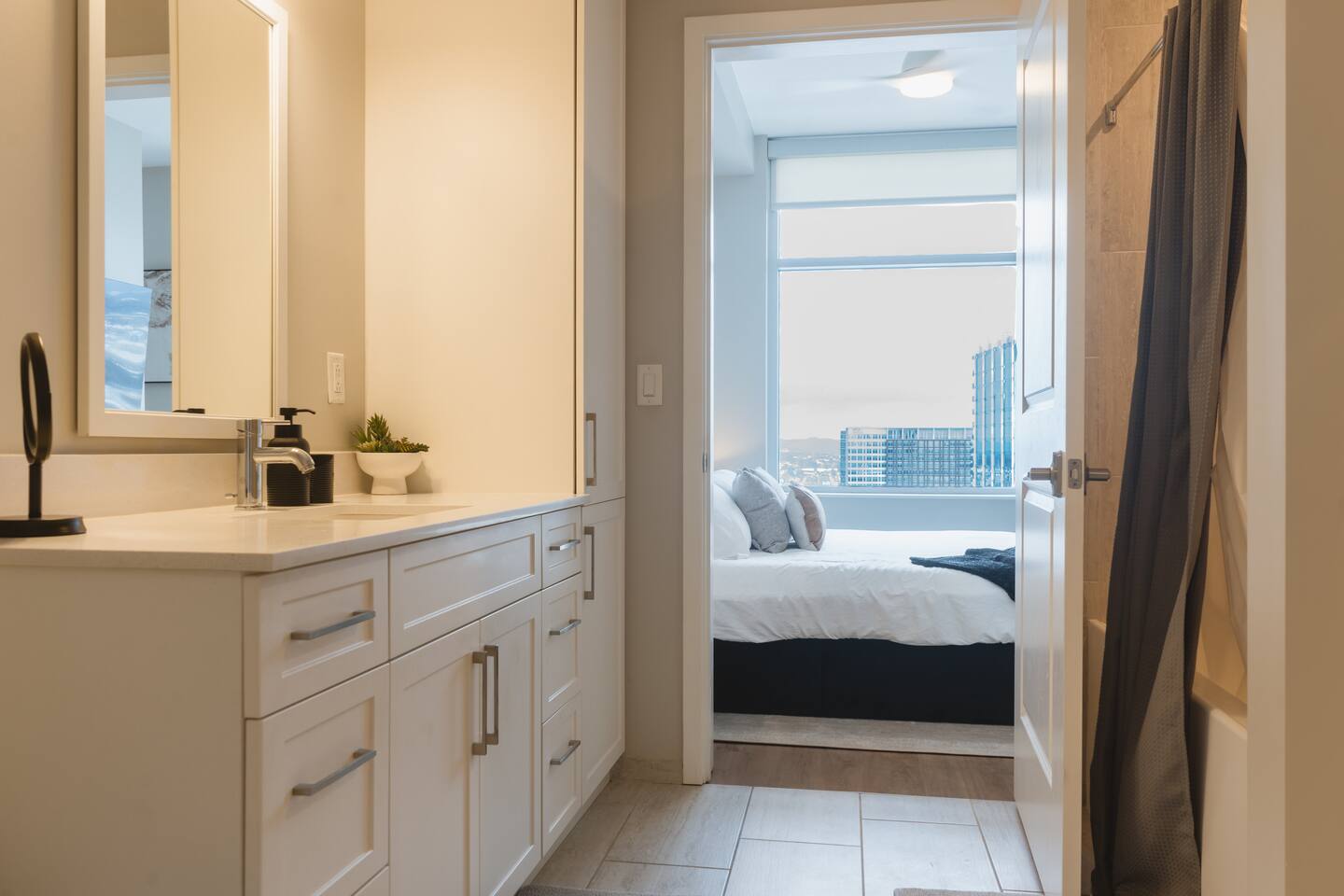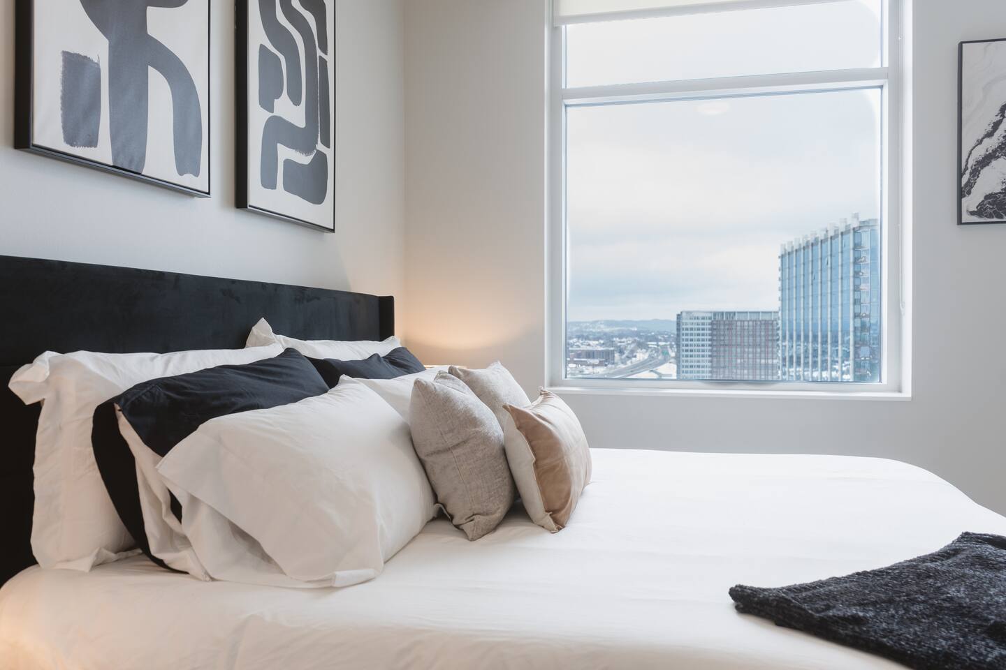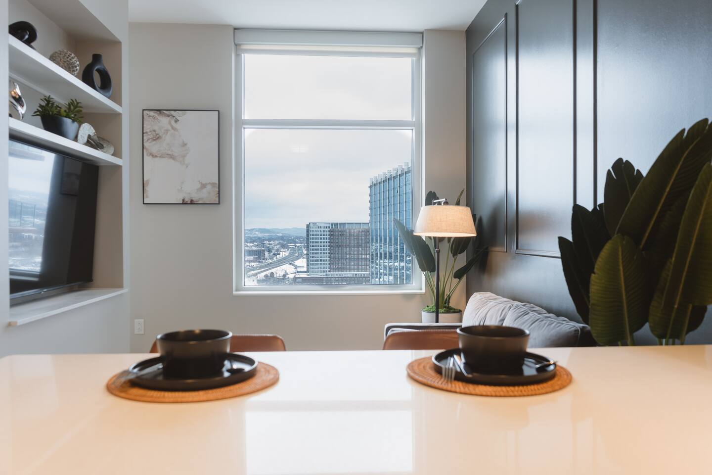 This studio apartment is designed with the modern traveler in mind, offering a seamless blend of comfort, style, and convenience. Whether you're here for work, leisure, or anything in between. The Building Located in The Gulch neighborhood, this high-rise apartment building offers the perfect combination of sophistication and modern comfort with premier amenities in an unparalleled location. The building boasts 24/7 concierge service and security, ensuring a safe and secure living experience. Kitchen As you enter, you're greeted by an urban mudroom and a fully equipped modern kitchen. Here you'll find everything you need from stainless steel appliances, a full size refrigerator, a gas range stove to a microwave. In the kitchen area, you’ll also find a large shelved pantry and the W/D unit. The coffee maker, toaster, blender, and water kettle sit alongside the countertops ready for any culinary needs. The kitchen is stocked with cookware, plate ware, and utensils. Perfect for preparing and enjoying meals at the bar top. Living Room The space flows seamlessly into a bright and inviting living room, complete with 11ft. floor-to ceiling windows with roller-shade coverings, a comfortable plush sofa that entices you to relax and unwind, and a Roku smart TV for streaming your favorite shows or watching a movie. Adjacent to the living area is a built-in desk, perfect for those who need a quiet spot to work or study with high-speed Wi-Fi access. Bedroom The bedroom is your private oasis, featuring a comfortable King-sized bed with premium bedding and soft pillows, ensuring a peaceful night's sleep. Large 11ft. windows fill the room with natural light, while roller shade curtains provide privacy and tranquility. Elegant bedside nightstands with soft dimmable lamps offer a touch of warmth and a Roku smart TV for streaming TV shows or watching a movie in bed. Bathroom The bathroom features modern fixtures, a walk-in shower and soft towels to create a spa-like environment. Closet The walk-in closet has ample space and a dresser to store your belongings, making it easy to settle in and feel at home.