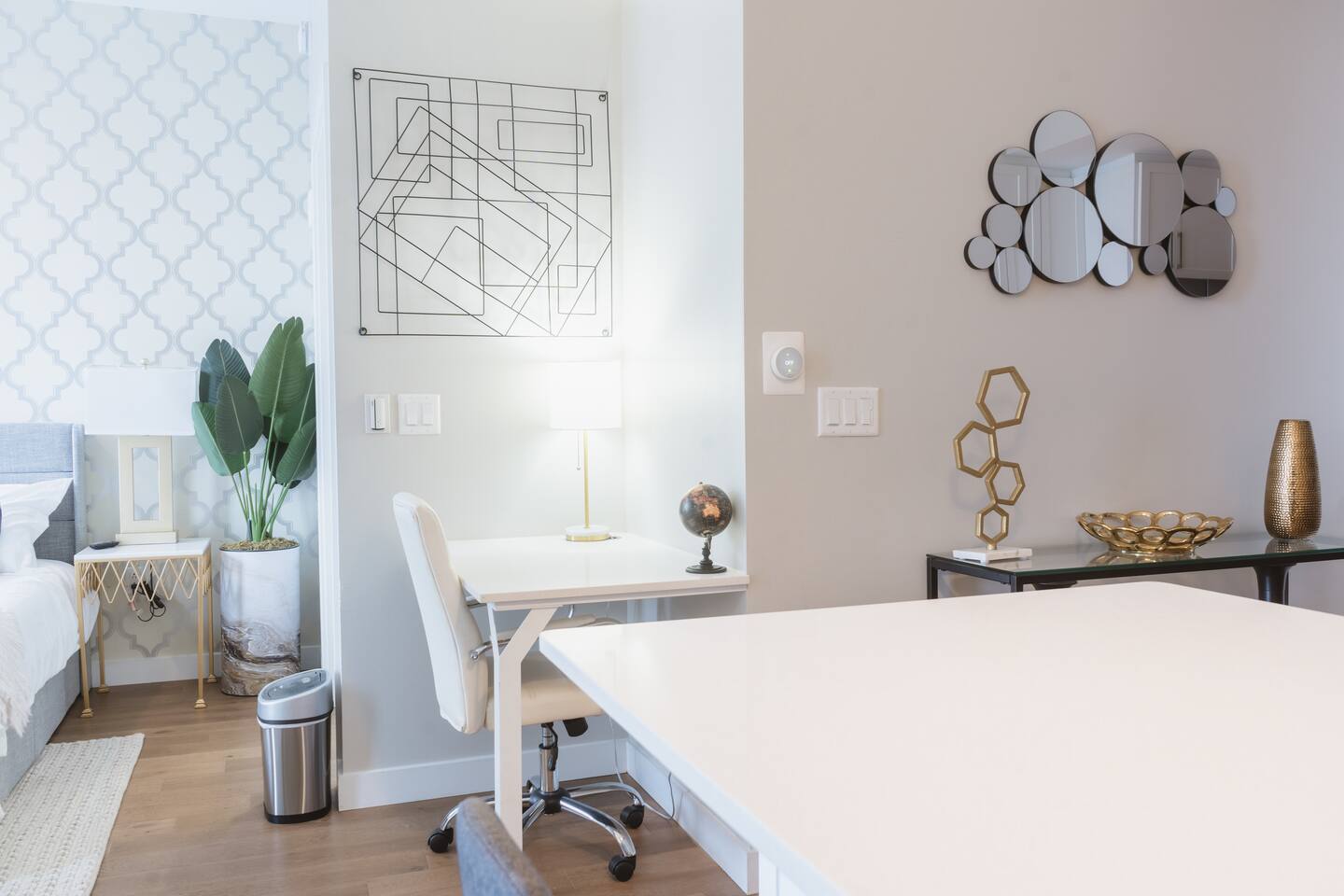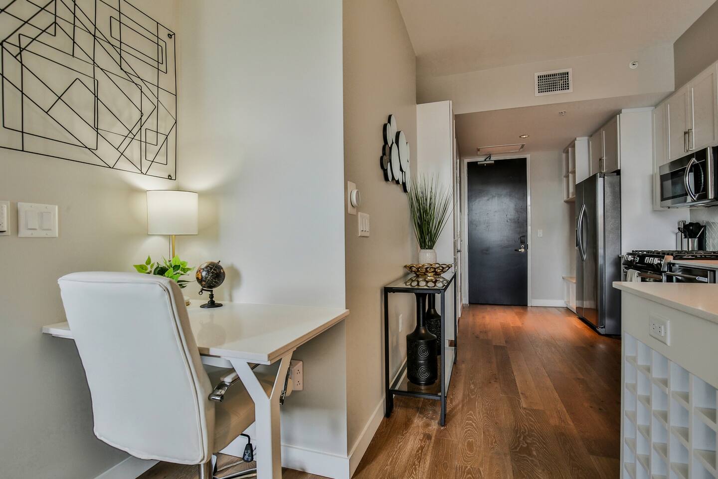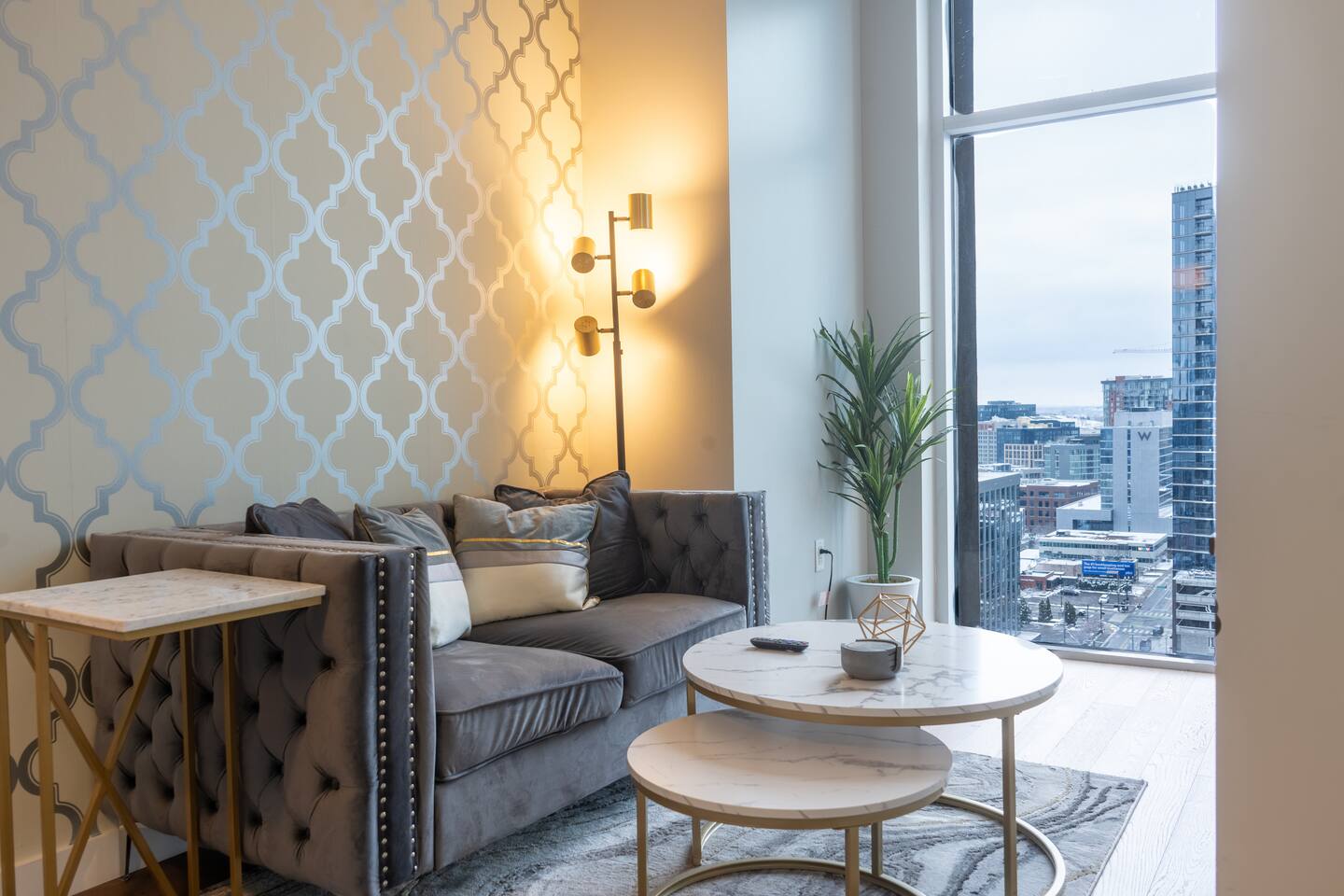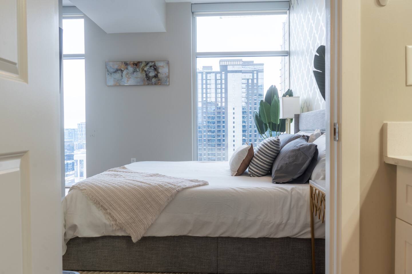 This studio apartment is designed with the modern traveler in mind, offering a seamless blend of comfort, style, and convenience. Whether you're here for work, leisure, or anything in between. The Building Located in The Gulch neighborhood, this high-rise apartment building offers the perfect combination of sophistication and modern comfort with premier amenities in an unparalleled location. The building boasts 24/7 concierge service and security, ensuring a safe and secure living experience. Kitchen As you enter, you're greeted by an urban mudroom and a fully equipped modern kitchen. Here you'll find everything you need from stainless steel appliances, a full size refrigerator, a gas range stove to a microwave. In the kitchen area, you’ll also find a large shelved pantry and the W/D unit. The coffee maker, toaster, blender, and water kettle sit alongside the countertops ready for any culinary needs. The kitchen is stocked with cookware, plate ware, and utensils. Perfect for preparing and enjoying meals at the bar top. Living Room The space flows seamlessly into a bright and inviting living room, complete with 11ft. floor-to ceiling windows with roller-shade coverings, a comfortable plush sofa that entices you to relax and unwind, and a 65" Roku smart TV for streaming your favorite shows or watching a movie. Adjacent to the living area is a built-in desk, perfect for those who need a quiet spot to work or study with high-speed Wi-Fi access. Bedroom The bedroom is your private oasis, featuring a comfortable queen-sized bed with premium bedding and soft pillows, ensuring a peaceful night's sleep. Large 11ft. windows fill the room with natural light, while roller shade curtains provide privacy and tranquility. Elegant bedside nightstands with soft dimmable lamps offer a touch of warmth and a 65” Roku smart TV for streaming TV shows or watching a movie in bed. Bathroom The bathroom features modern fixtures, a walk-in shower and soft towels to create a spa-like environment. Closet The walk-in closet has ample space and a dresser to store your belongings, making it easy to settle in and feel at home.