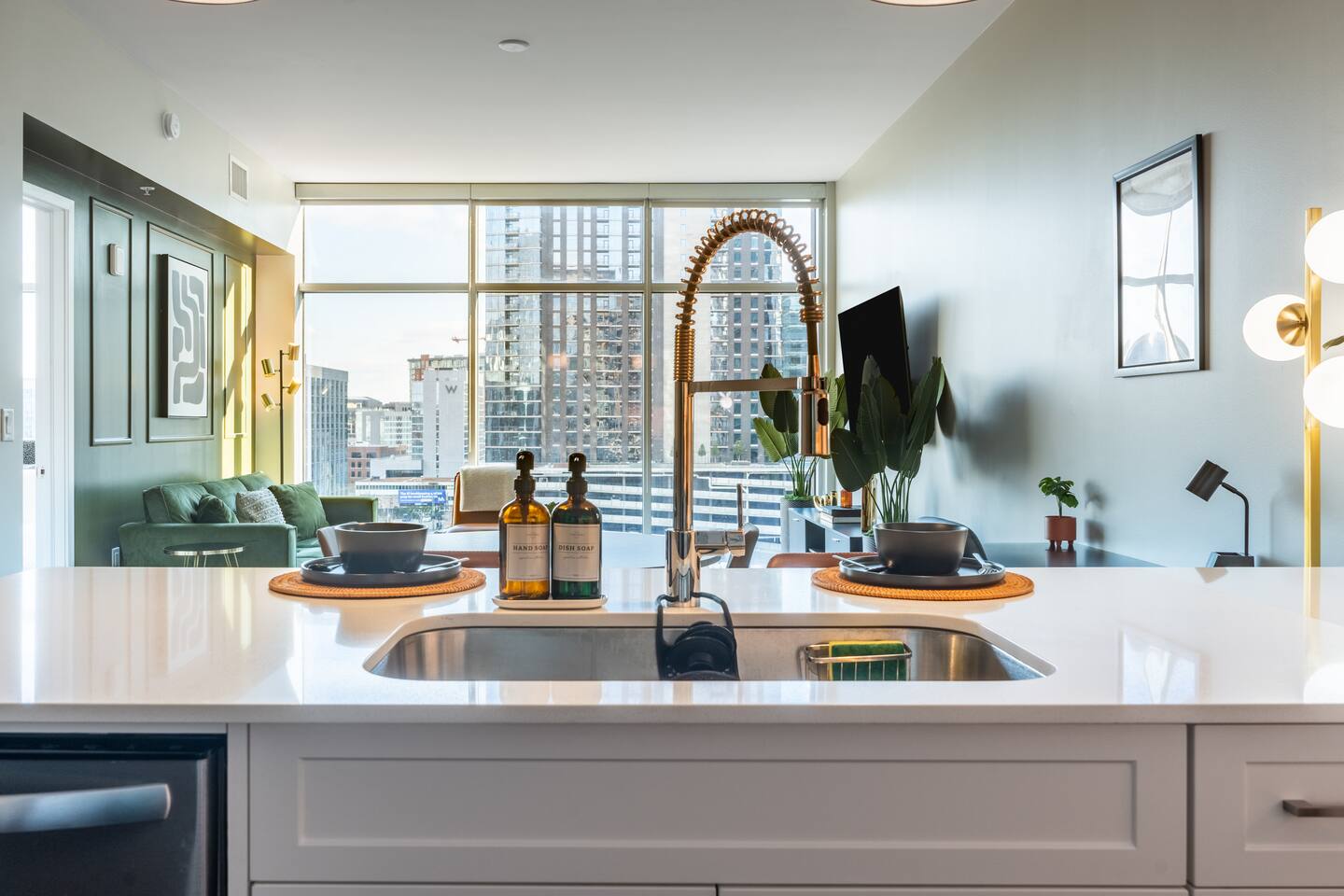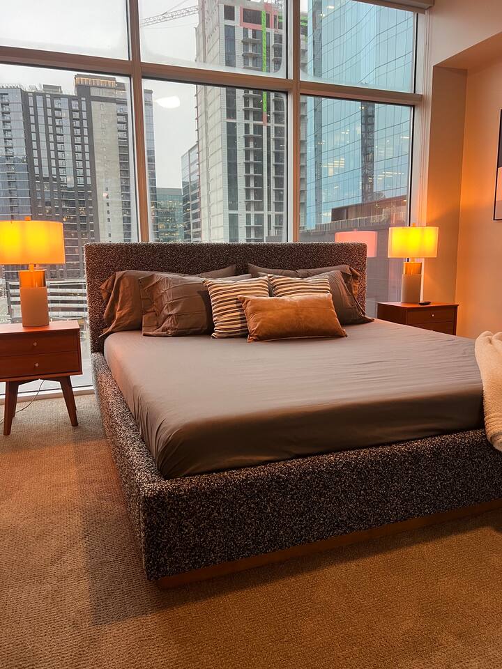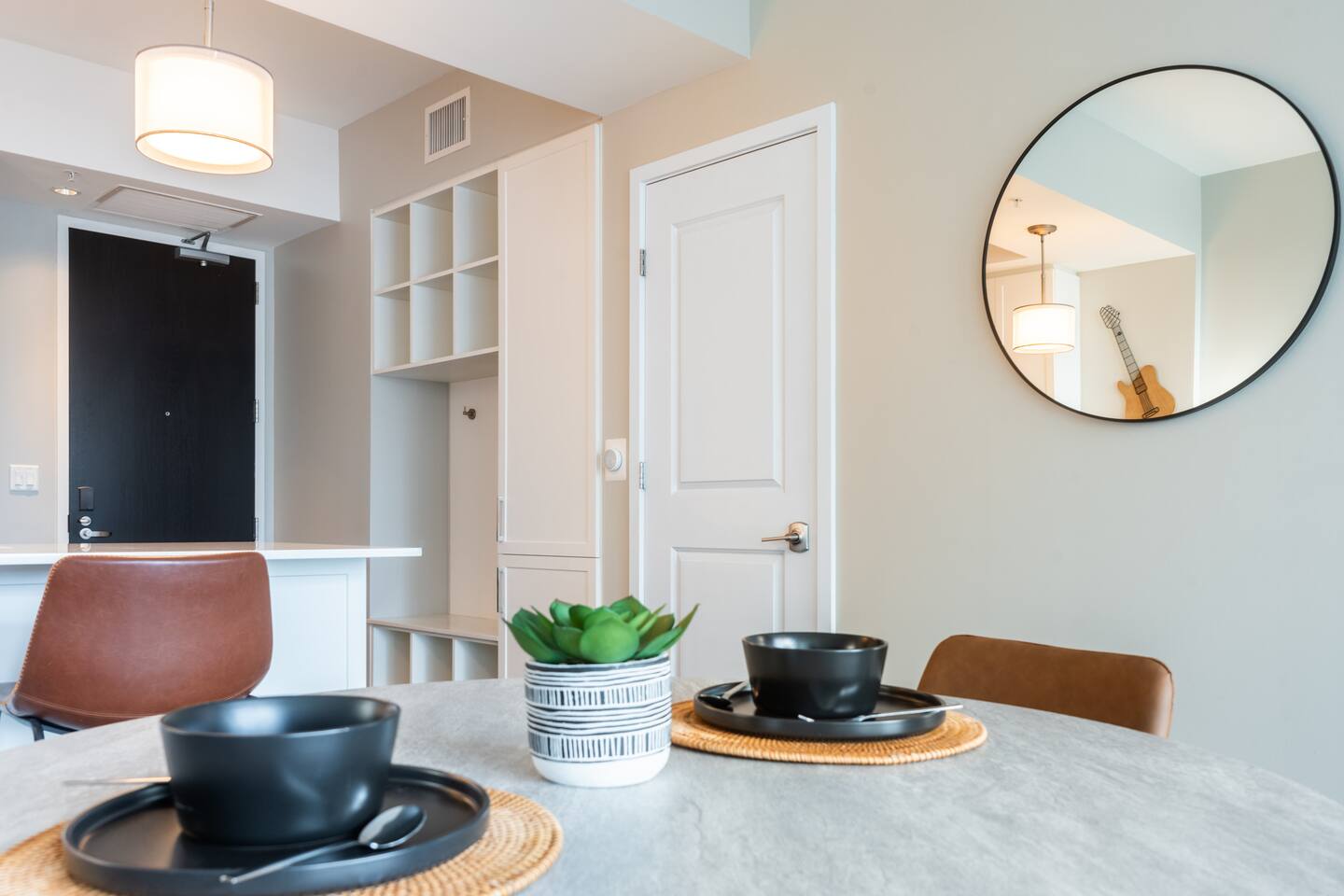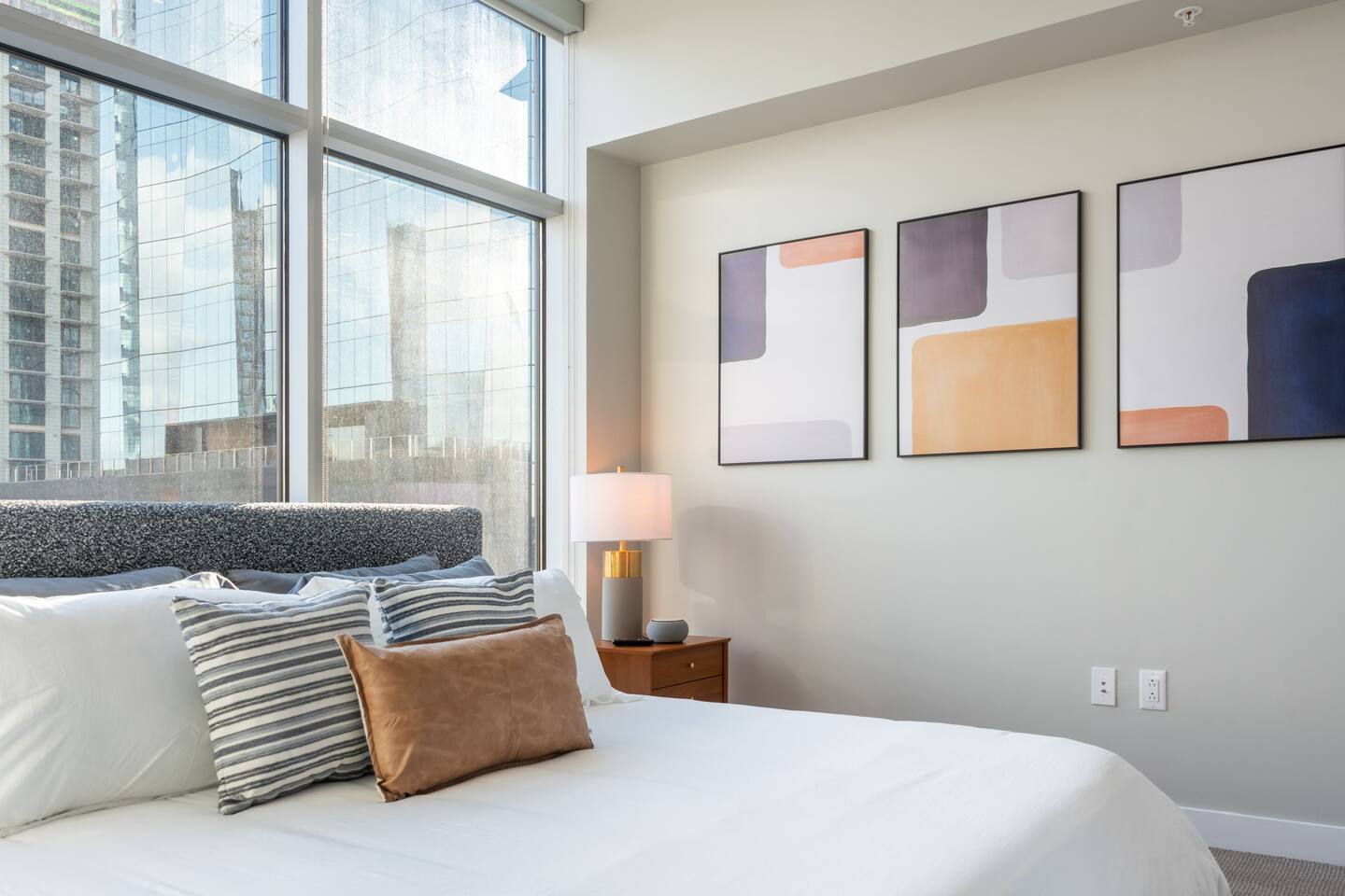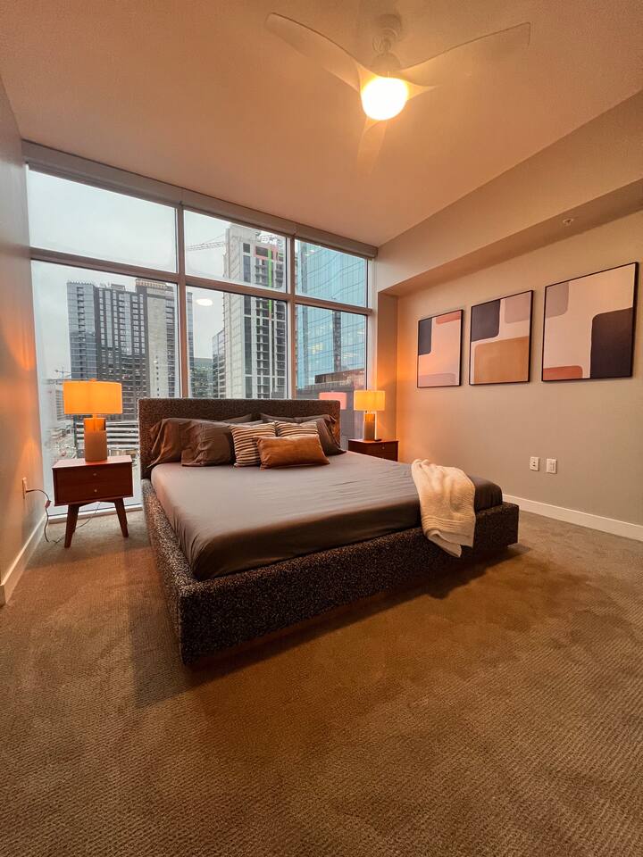 This apartment was designed with the modern traveler in mind, offering a seamless blend of comfort, style, and convenience. Whether you're here for work, leisure, or anything in between. The Building Located in The Gulch neighborhood, this high-rise apartment building offers the perfect combination of sophistication and modern comfort with premier amenities in an unparalleled location. The building boasts 24/7 concierge service and security, ensuring a safe and secure living experience. Kitchen As you enter, you're greeted by an urban mudroom and a fully equipped modern kitchen. Here you'll find everything you need from stainless steel appliances, a full size refrigerator, a gas range stove to a microwave. In the kitchen area, you’ll also find a large shelved pantry and the W/D unit. The coffee maker, toaster, blender, and water kettle sit alongside the countertops ready for any culinary needs. The kitchen is stocked with cookware, plate ware, and utensils. Perfect for preparing and enjoying meals at the bar top. Living Room The space flows seamlessly into a bright, inviting dining room and living room complete with 11ft. floor-to ceiling windows with roller-shade coverings, a round dining table set, a comfortable plush sofa that entices you to relax and unwind, and a 65" Roku smart TV for streaming your favorite shows or watching a movie. In the living area is a desk, perfect for those who need a quiet spot to work or study with high-speed Wi-Fi access. Bedroom The bedroom is your private oasis, featuring a comfortable King-sized bed with premium bedding and soft pillows, ensuring a peaceful night's sleep. Large 11ft. windows fill the room with natural light, while roller shade curtains provide privacy and tranquility. Elegant bedside nightstands with soft dimmable lamps offer a touch of warmth and a 65” Roku smart TV for streaming TV shows or watching a movie in bed. Bathroom The bathroom features modern fixtures, a walk-in shower and soft towels to create a spa-like environment. Closet The walk-in closet has ample space and a dresser to store your belongings, making it easy to settle in and feel at home. Laundry The unit has its own Washer and Dryer.