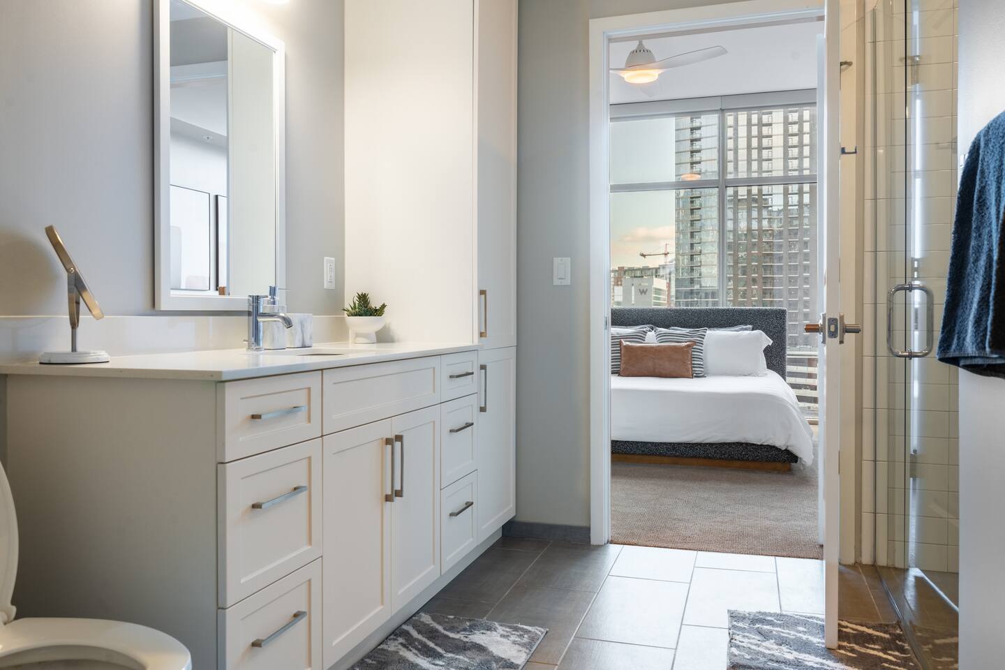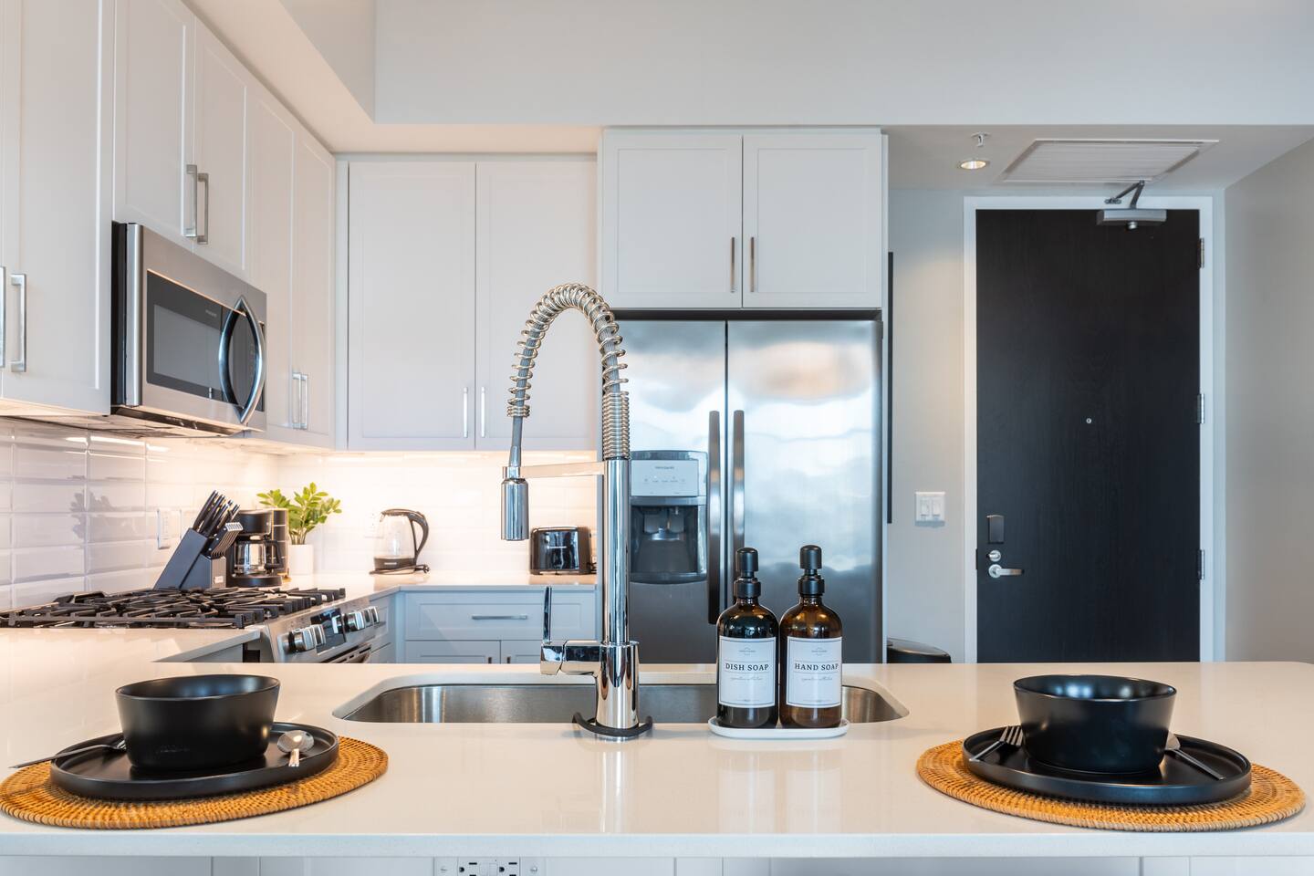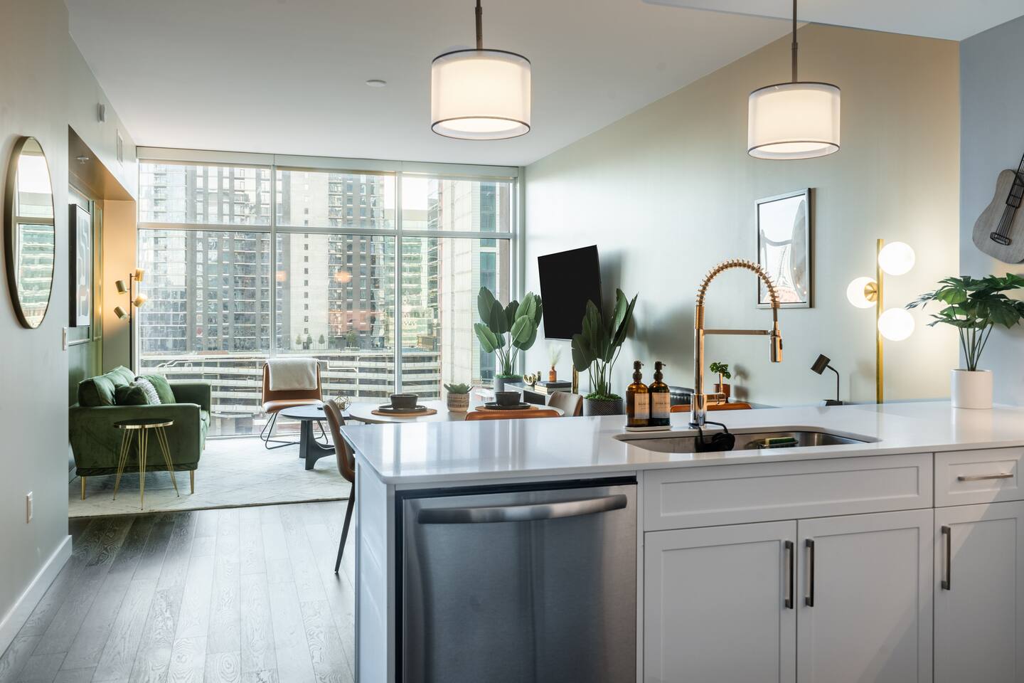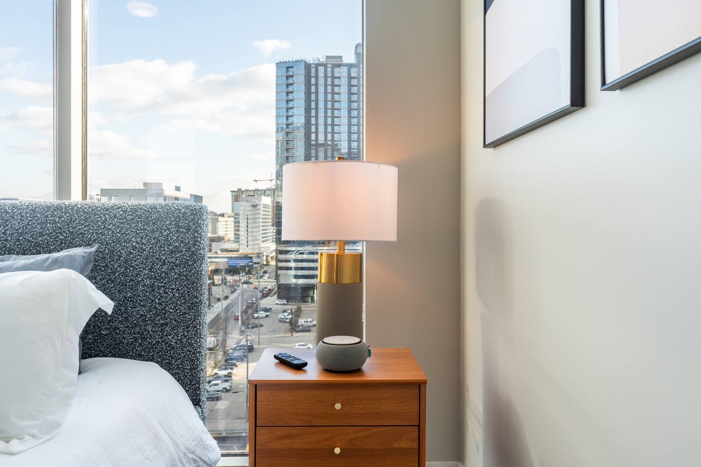 This apartment was designed with the modern traveler in mind, offering a seamless blend of comfort, style, and convenience. Whether you're here for work, leisure, or anything in between. The Building Located in The Gulch neighborhood, this high-rise apartment building offers the perfect combination of sophistication and modern comfort with premier amenities in an unparalleled location. The building boasts 24/7 concierge service and security, ensuring a safe and secure living experience. Kitchen As you enter, you're greeted by an urban mudroom and a fully equipped modern kitchen. Here you'll find everything you need from stainless steel appliances, a full size refrigerator, a gas range stove to a microwave. In the kitchen area, you’ll also find a large shelved pantry and the W/D unit. The coffee maker, toaster, blender, and water kettle sit alongside the countertops ready for any culinary needs. The kitchen is stocked with cookware, plate ware, and utensils. Perfect for preparing and enjoying meals at the bar top. Living Room The space flows seamlessly into a bright, inviting dining room and living room complete with 11ft. floor-to ceiling windows with roller-shade coverings, a round dining table set, a comfortable plush sofa that entices you to relax and unwind, and a 65" Roku smart TV for streaming your favorite shows or watching a movie. In the living area is a desk, perfect for those who need a quiet spot to work or study with high-speed Wi-Fi access. Bedroom The bedroom is your private oasis, featuring a comfortable King-sized bed with premium bedding and soft pillows, ensuring a peaceful night's sleep. Large 11ft. windows fill the room with natural light, while roller shade curtains provide privacy and tranquility. Elegant bedside nightstands with soft dimmable lamps offer a touch of warmth and a 65” Roku smart TV for streaming TV shows or watching a movie in bed. Bathroom The bathroom features modern fixtures, a walk-in shower and soft towels to create a spa-like environment. Closet The walk-in closet has ample space and a dresser to store your belongings, making it easy to settle in and feel at home. Laundry The unit has its own Washer and Dryer.