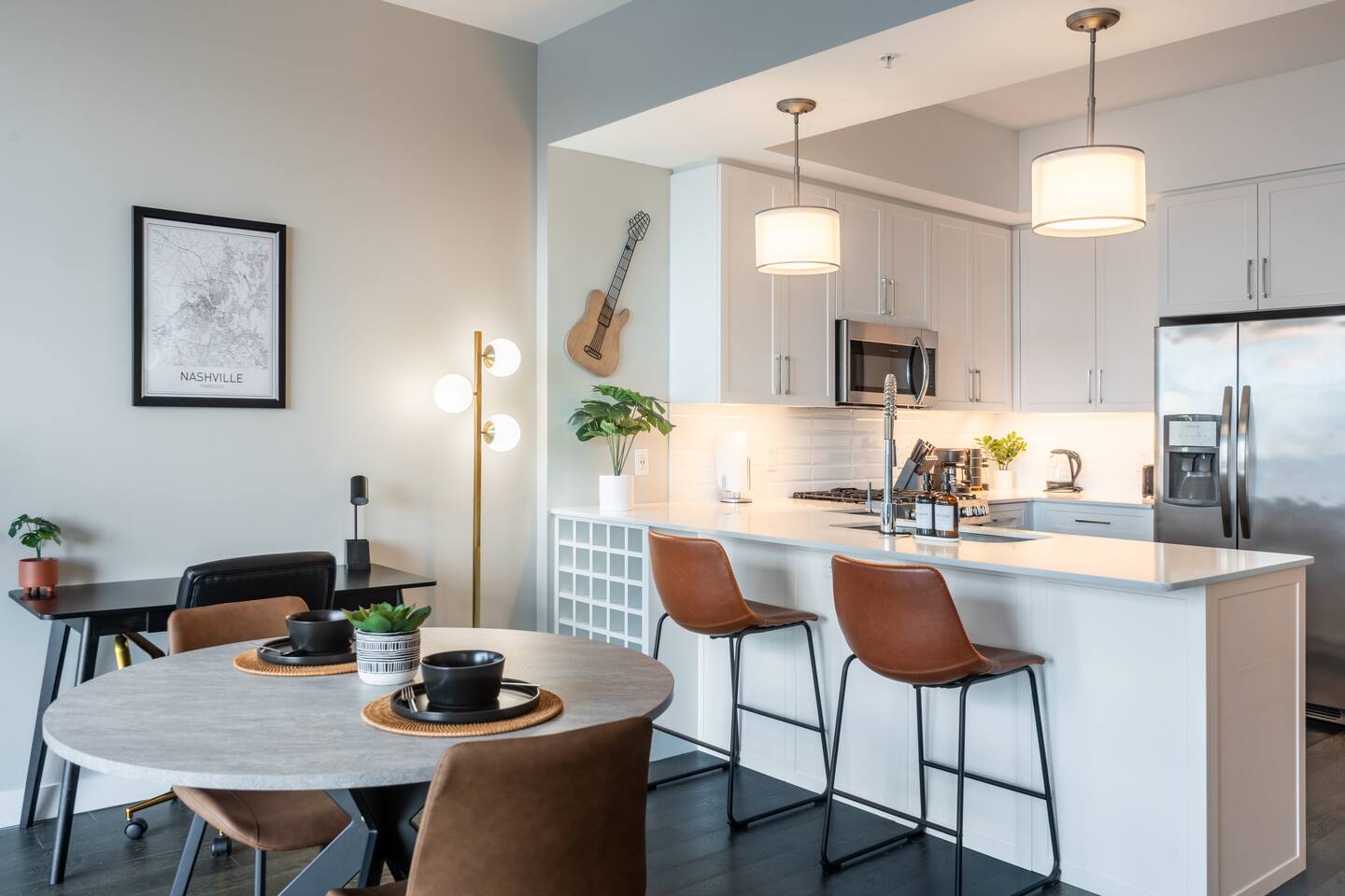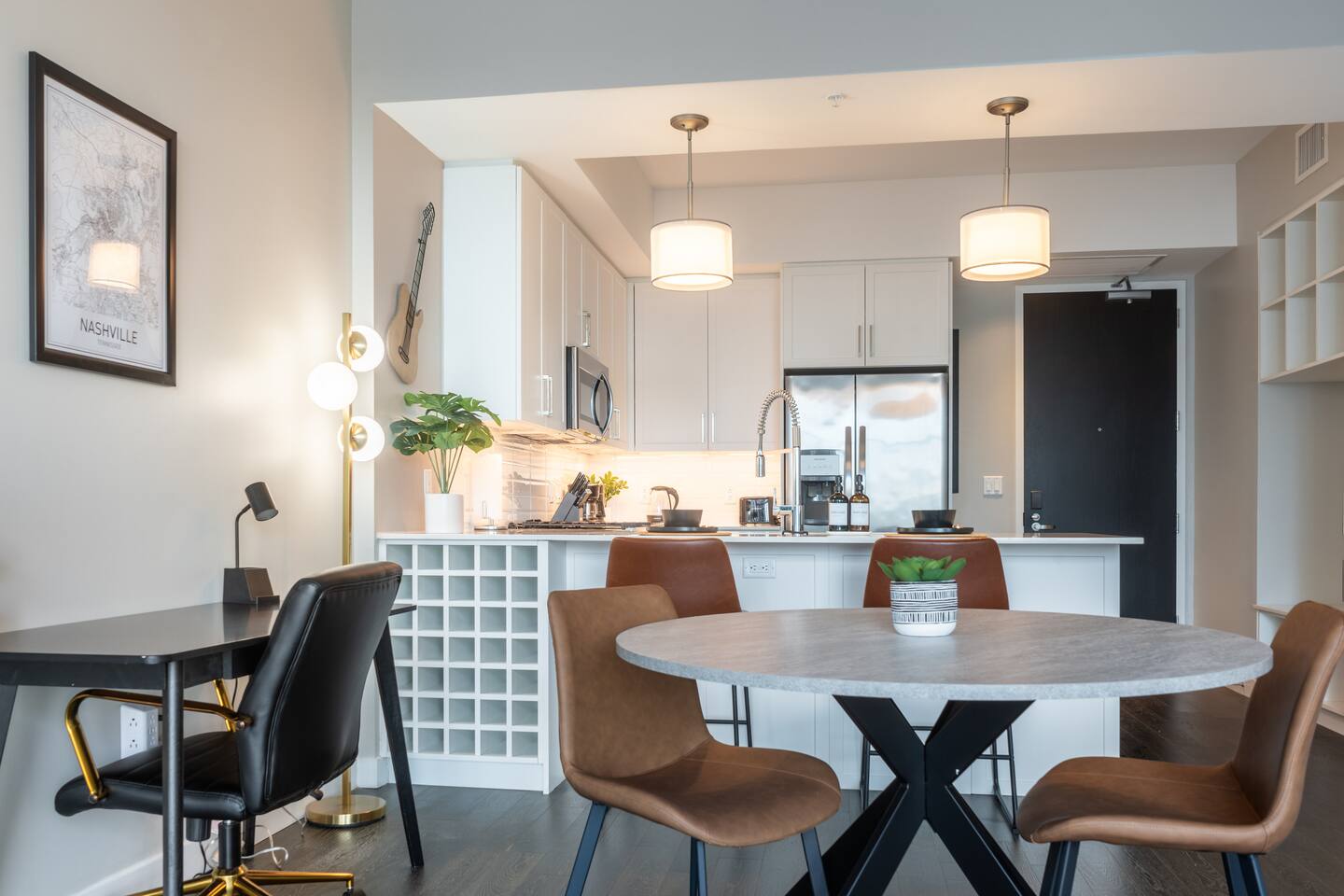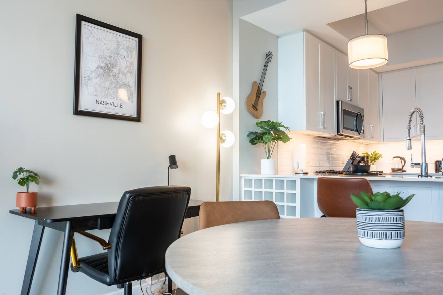 Welcome to your modern studio apartment home on the iconic Broadway Street in the heart of Nashville! This studio is perfect for professionals, couples, relocations, digital nomads, remote workers, students, interns and is connected to a Whole Foods Market! Enjoy a comfortable King bed, fully equipped kitchen, high-speed Wi-Fi, dedicated workspace, in-unit laundry, free parking, gym and top notch amenities. Ideal for extended stays. Send me a message for any questions about the unit or property!