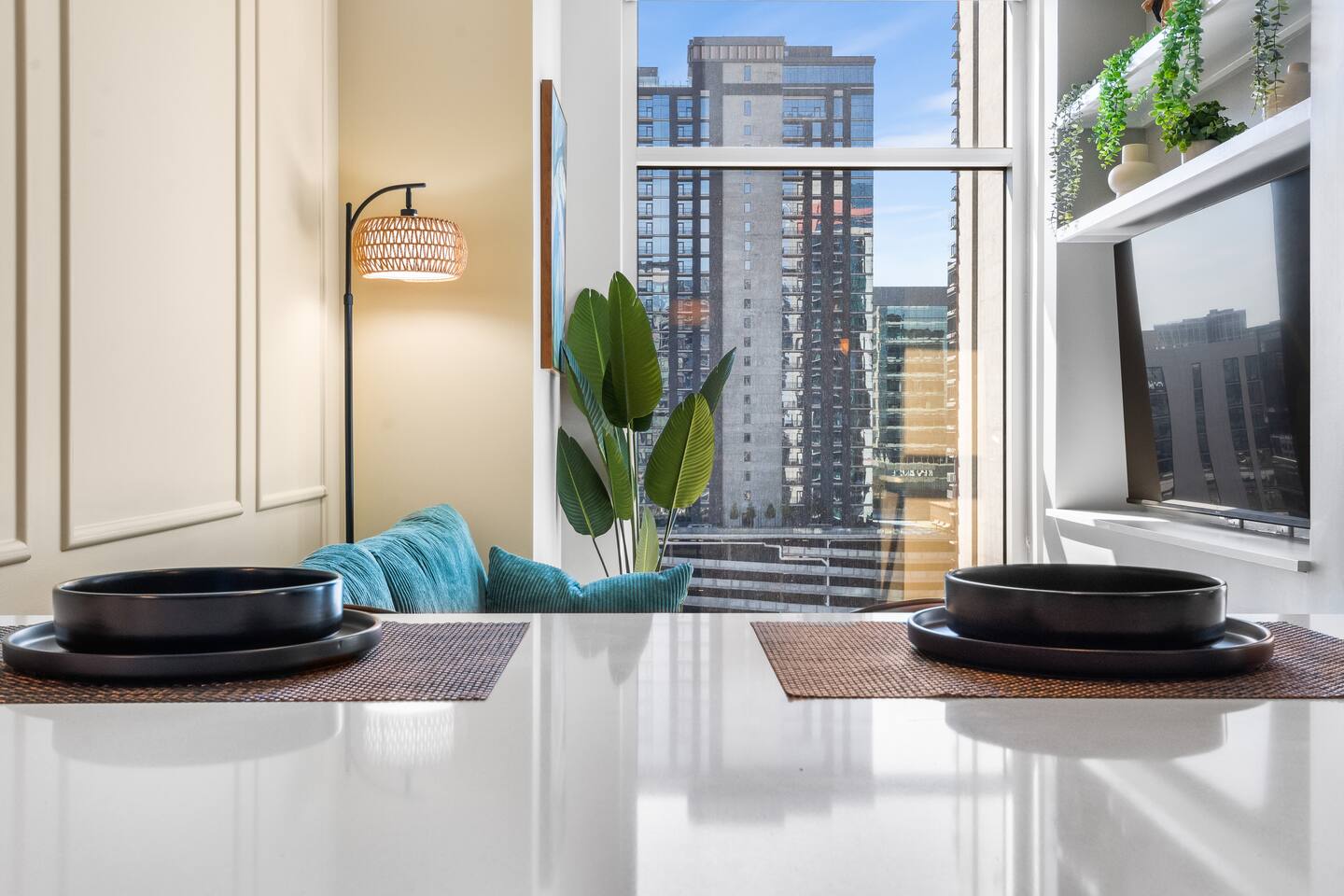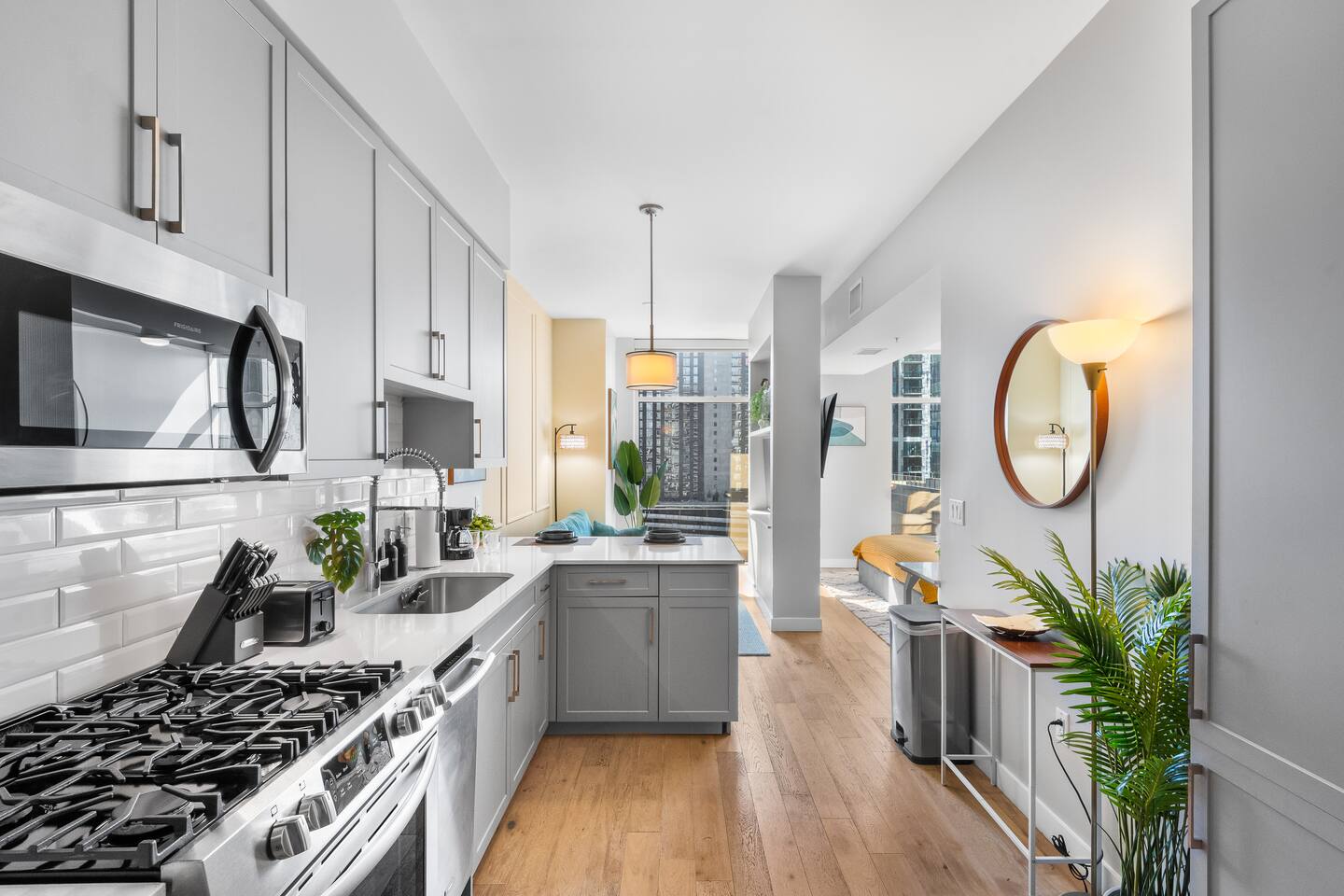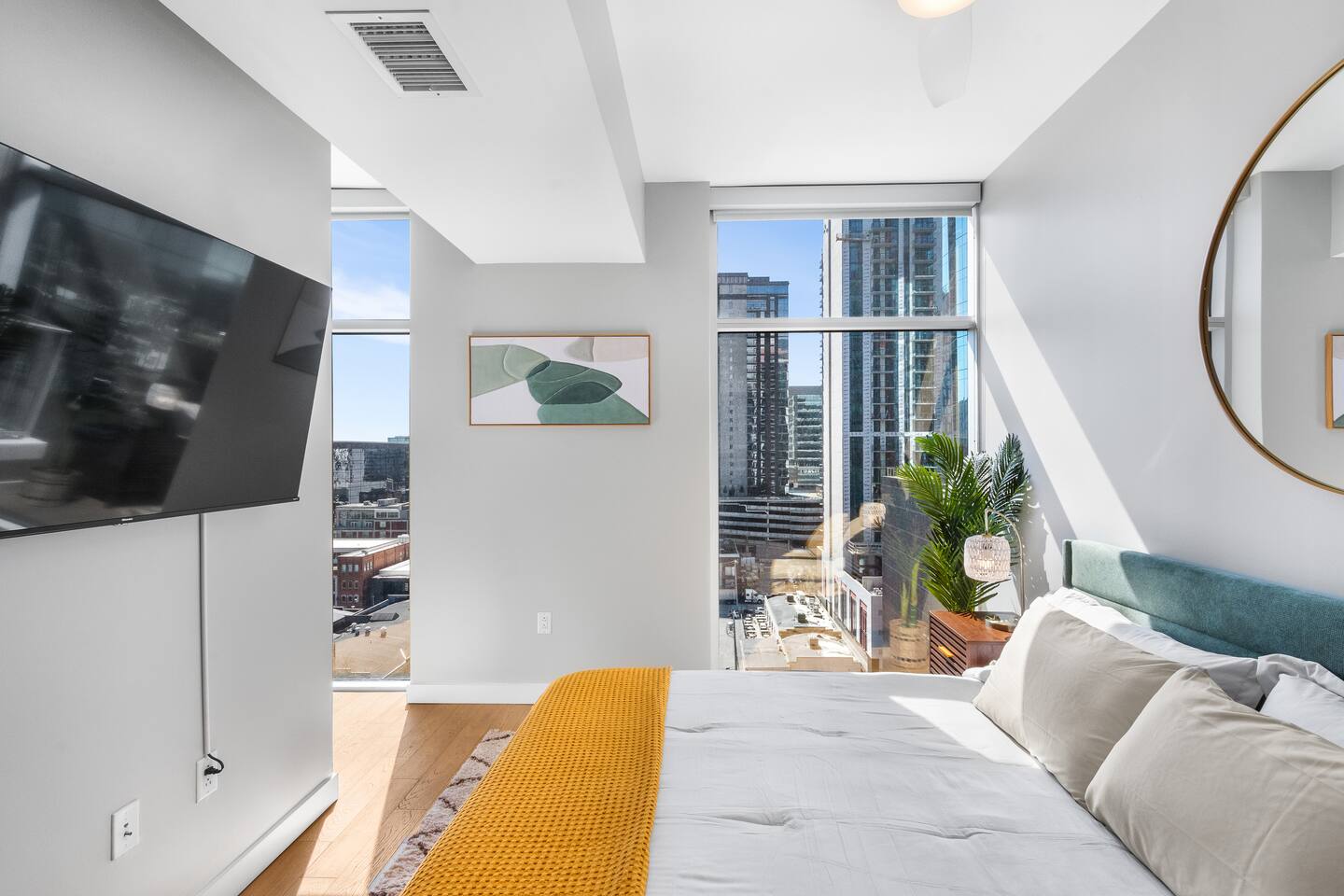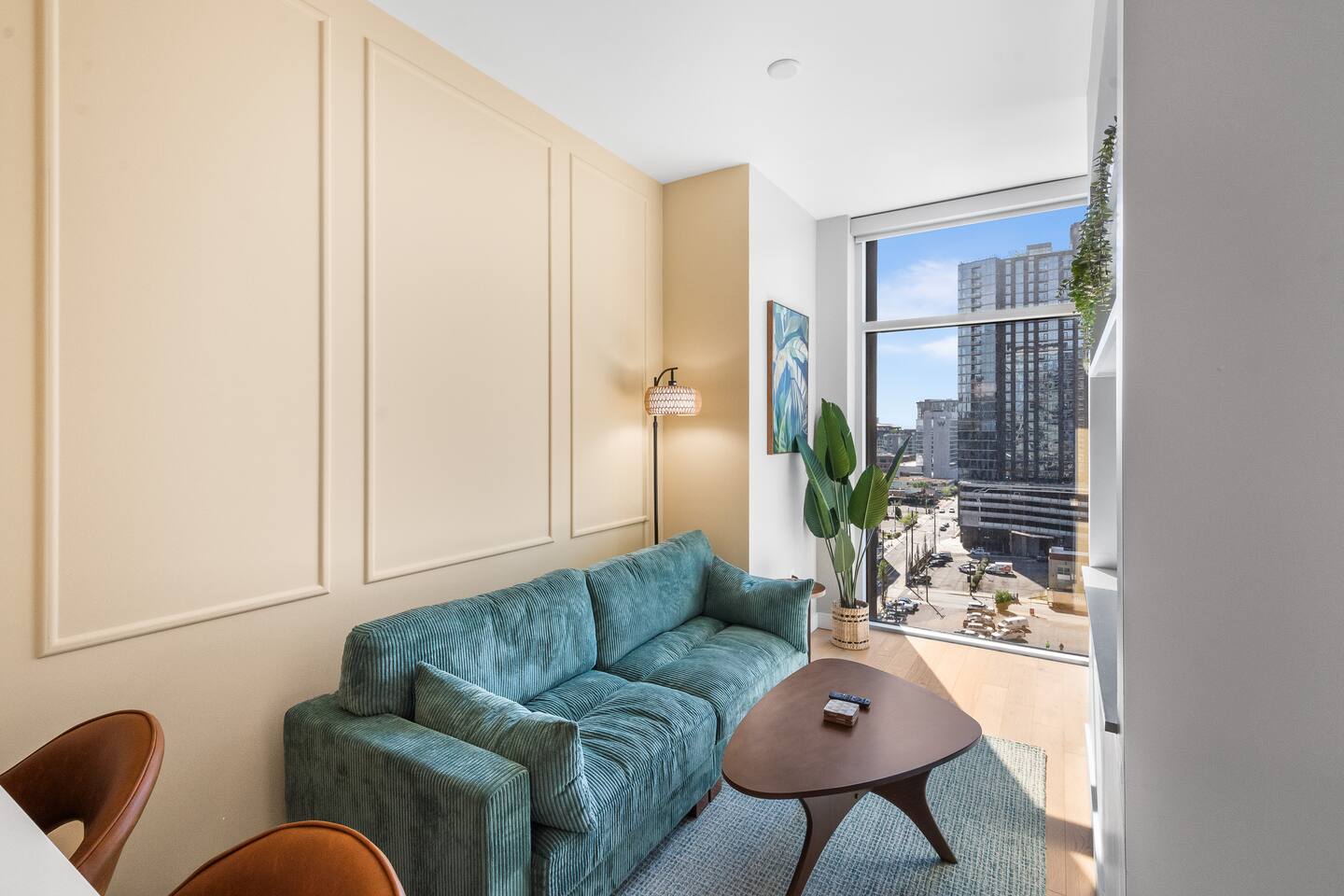 This studio apartment is designed with the modern traveler in mind, offering a seamless blend of comfort, style, and convenience. Whether you're here for work, leisure, or anything in between. The Building Located in The Gulch neighborhood, this high-rise apartment building offers the perfect combination of sophistication and modern comfort with premier amenities in an unparalleled location. The building boasts 24/7 concierge service and security, ensuring a safe and secure living experience. Kitchen As you enter, you're greeted by an urban mudroom and a fully equipped modern kitchen. Here you'll find everything you need from stainless steel appliances, a full size refrigerator, a gas range stove to a microwave. In the kitchen area, you’ll also find a large shelved pantry and the W/D unit. The coffee maker, toaster, blender, and water kettle sit alongside the countertops ready for any culinary needs. The kitchen is stocked with cookware, plate ware, and utensils. Perfect for preparing and enjoying meals at the bar top. Living Room The space flows seamlessly into a bright and inviting living room, complete with 11ft. floor-to ceiling windows with roller-shade coverings, a comfortable plush sofa that entices you to relax and unwind, and a 65" Roku smart TV for streaming your favorite shows or watching a movie. Adjacent to the living area is a built-in desk, perfect for those who need a quiet spot to work or study with high-speed Wi-Fi access. Bedroom The bedroom is your private oasis, featuring a comfortable King-sized bed with premium bedding and soft pillows, ensuring a peaceful night's sleep. Large 11ft. windows fill the room with natural light, while roller shade curtains provide privacy and tranquility. Elegant bedside nightstands with soft dimmable lamps offer a touch of warmth and a 65” Roku smart TV for streaming TV shows or watching a movie in bed. Bathroom The bathroom features modern fixtures, a walk-in shower and soft towels to create a spa-like environment. Closet The walk-in closet has ample space and a dresser to store your belongings, making it easy to settle in and feel at home.