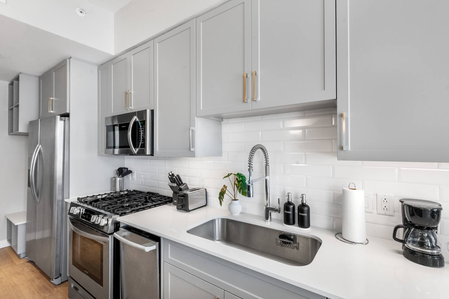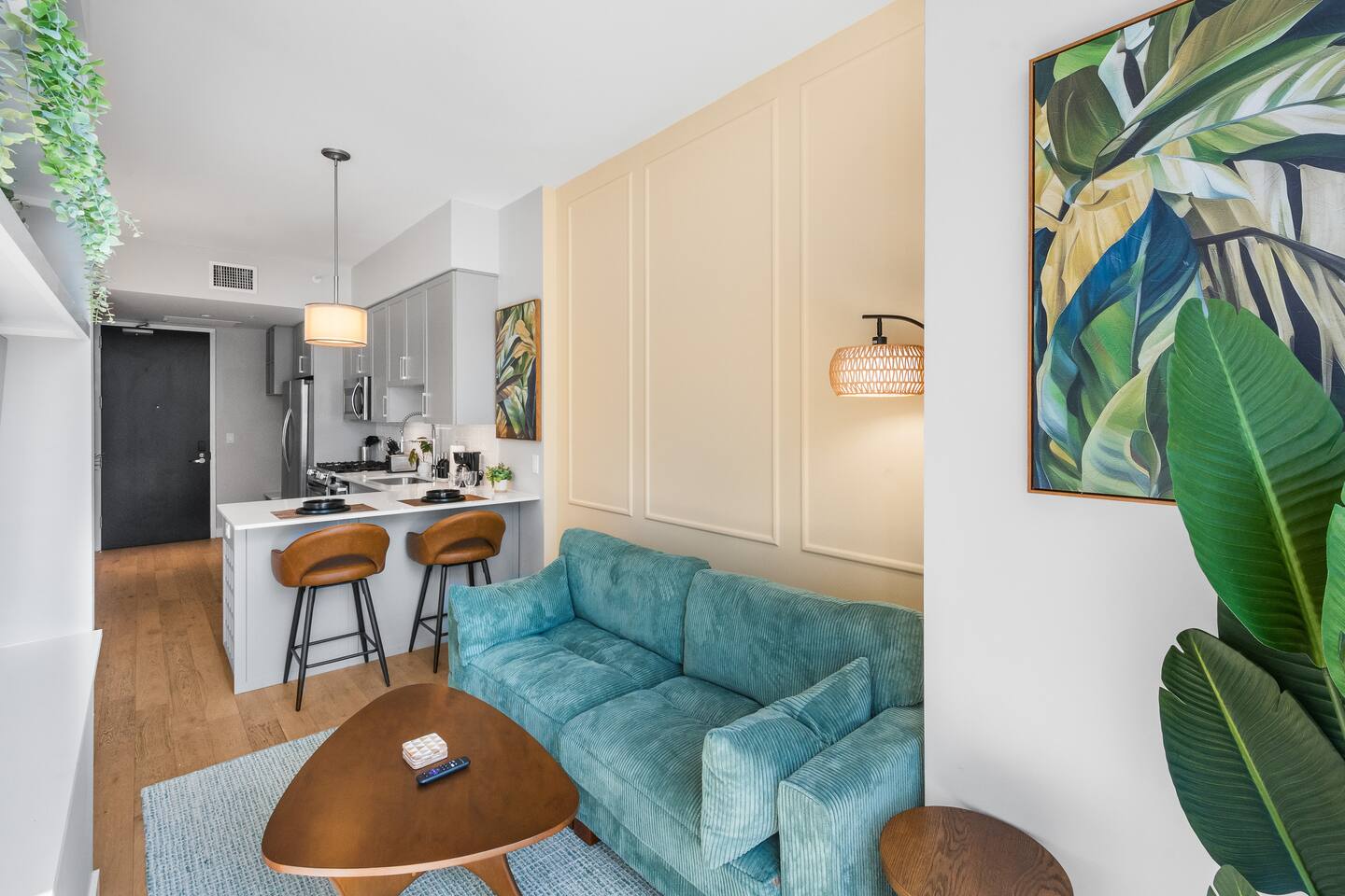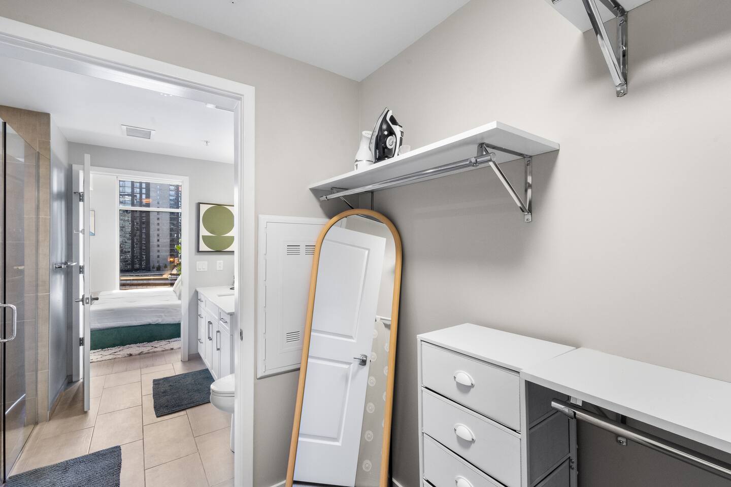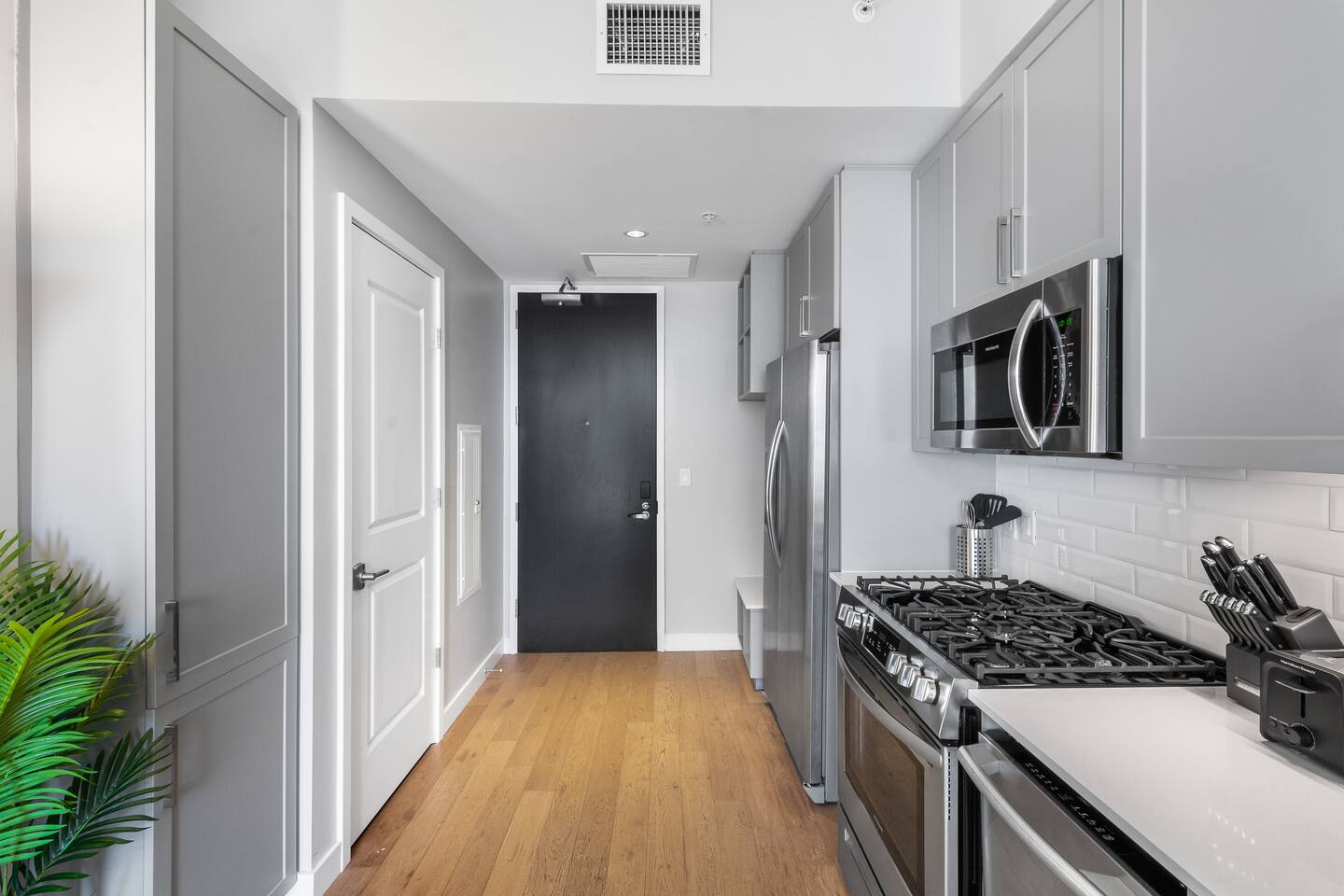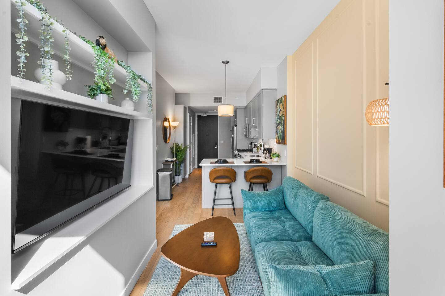 This studio apartment is designed with the modern traveler in mind, offering a seamless blend of comfort, style, and convenience. Whether you're here for work, leisure, or anything in between. The Building Located in The Gulch neighborhood, this high-rise apartment building offers the perfect combination of sophistication and modern comfort with premier amenities in an unparalleled location. The building boasts 24/7 concierge service and security, ensuring a safe and secure living experience. Kitchen As you enter, you're greeted by an urban mudroom and a fully equipped modern kitchen. Here you'll find everything you need from stainless steel appliances, a full size refrigerator, a gas range stove to a microwave. In the kitchen area, you’ll also find a large shelved pantry and the W/D unit. The coffee maker, toaster, blender, and water kettle sit alongside the countertops ready for any culinary needs. The kitchen is stocked with cookware, plate ware, and utensils. Perfect for preparing and enjoying meals at the bar top. Living Room The space flows seamlessly into a bright and inviting living room, complete with 11ft. floor-to ceiling windows with roller-shade coverings, a comfortable plush sofa that entices you to relax and unwind, and a 65" Roku smart TV for streaming your favorite shows or watching a movie. Adjacent to the living area is a built-in desk, perfect for those who need a quiet spot to work or study with high-speed Wi-Fi access. Bedroom The bedroom is your private oasis, featuring a comfortable King-sized bed with premium bedding and soft pillows, ensuring a peaceful night's sleep. Large 11ft. windows fill the room with natural light, while roller shade curtains provide privacy and tranquility. Elegant bedside nightstands with soft dimmable lamps offer a touch of warmth and a 65” Roku smart TV for streaming TV shows or watching a movie in bed. Bathroom The bathroom features modern fixtures, a walk-in shower and soft towels to create a spa-like environment. Closet The walk-in closet has ample space and a dresser to store your belongings, making it easy to settle in and feel at home.