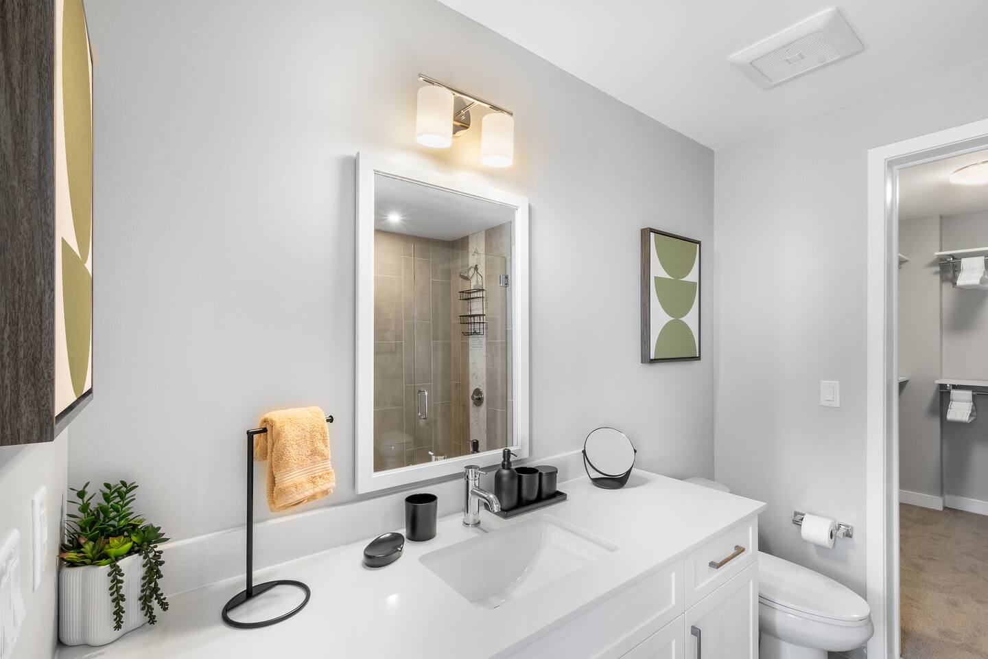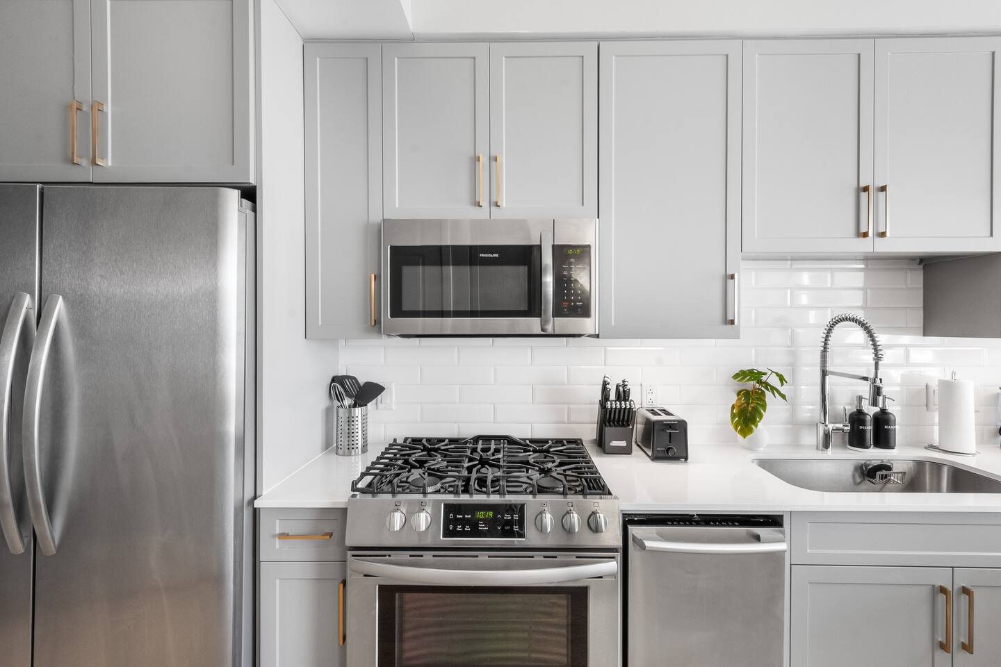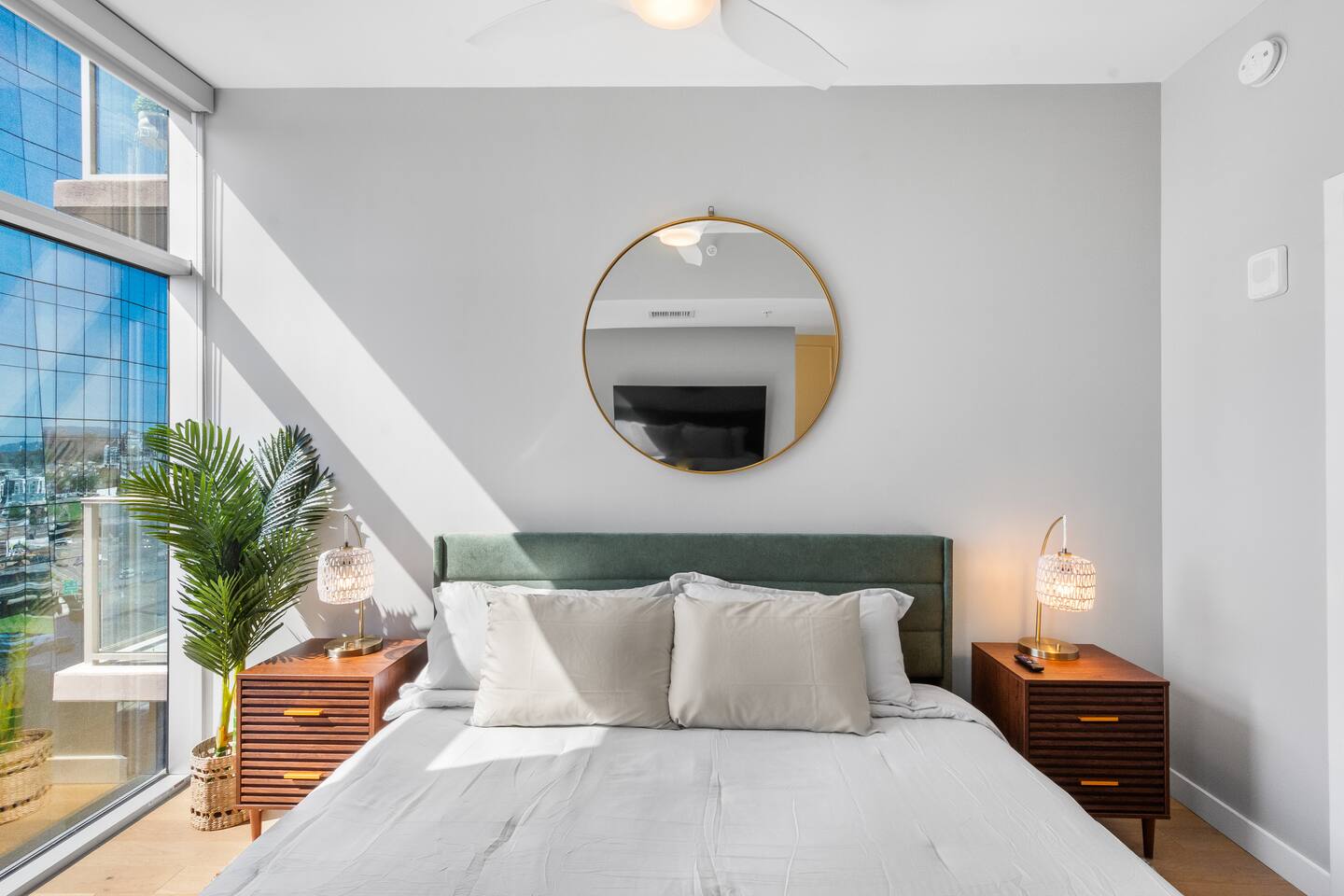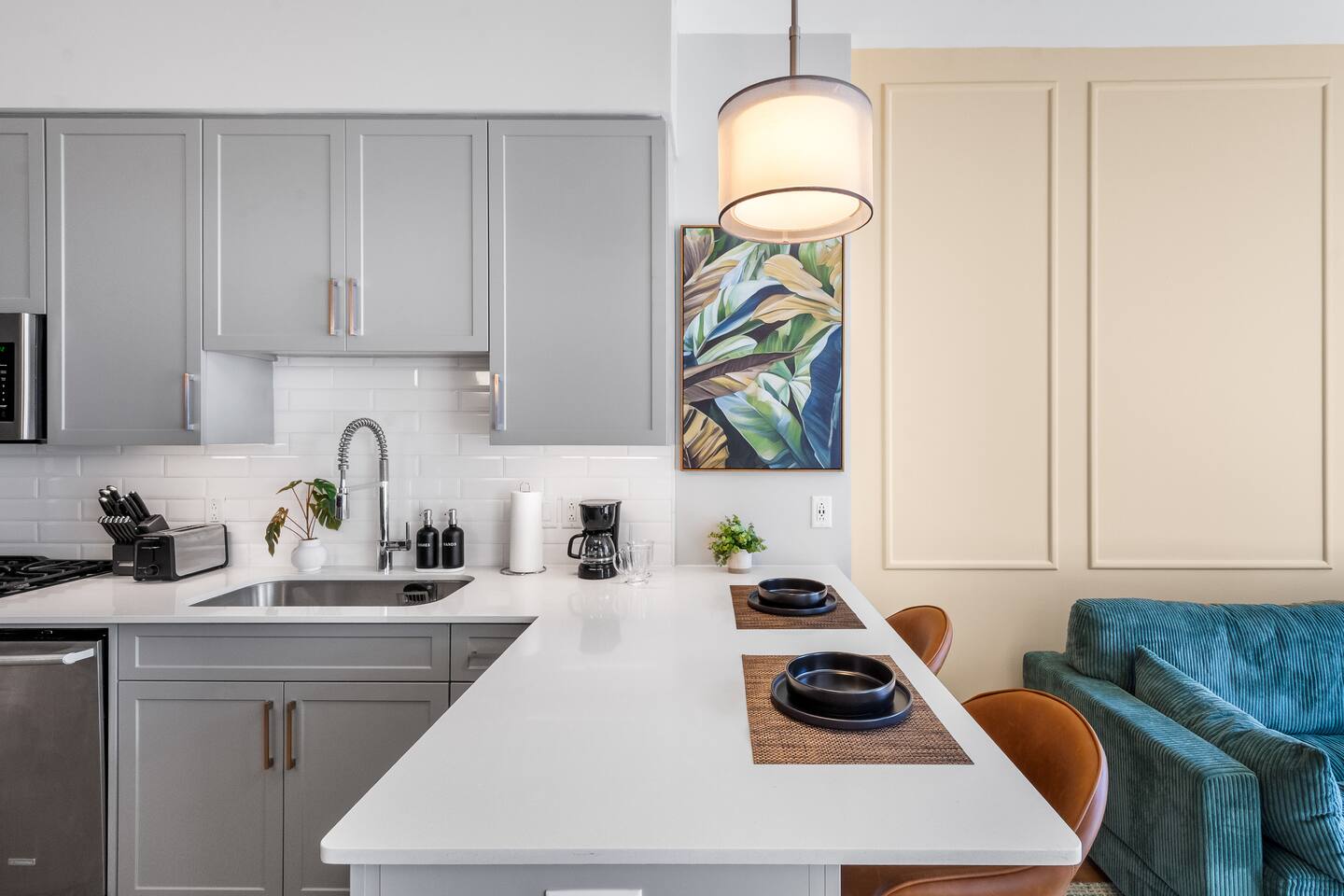 This studio apartment is designed with the modern traveler in mind, offering a seamless blend of comfort, style, and convenience. Whether you're here for work, leisure, or anything in between. The Building Located in The Gulch neighborhood, this high-rise apartment building offers the perfect combination of sophistication and modern comfort with premier amenities in an unparalleled location. The building boasts 24/7 concierge service and security, ensuring a safe and secure living experience. Kitchen As you enter, you're greeted by an urban mudroom and a fully equipped modern kitchen. Here you'll find everything you need from stainless steel appliances, a full size refrigerator, a gas range stove to a microwave. In the kitchen area, you’ll also find a large shelved pantry and the W/D unit. The coffee maker, toaster, blender, and water kettle sit alongside the countertops ready for any culinary needs. The kitchen is stocked with cookware, plate ware, and utensils. Perfect for preparing and enjoying meals at the bar top. Living Room The space flows seamlessly into a bright and inviting living room, complete with 11ft. floor-to ceiling windows with roller-shade coverings, a comfortable plush sofa that entices you to relax and unwind, and a 65" Roku smart TV for streaming your favorite shows or watching a movie. Adjacent to the living area is a built-in desk, perfect for those who need a quiet spot to work or study with high-speed Wi-Fi access. Bedroom The bedroom is your private oasis, featuring a comfortable King-sized bed with premium bedding and soft pillows, ensuring a peaceful night's sleep. Large 11ft. windows fill the room with natural light, while roller shade curtains provide privacy and tranquility. Elegant bedside nightstands with soft dimmable lamps offer a touch of warmth and a 65” Roku smart TV for streaming TV shows or watching a movie in bed. Bathroom The bathroom features modern fixtures, a walk-in shower and soft towels to create a spa-like environment. Closet The walk-in closet has ample space and a dresser to store your belongings, making it easy to settle in and feel at home.
